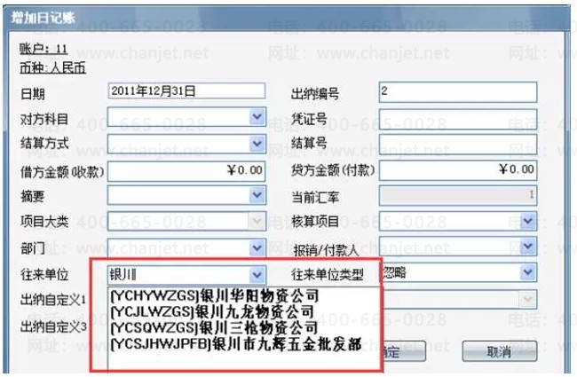 例如,某用户平时录入日记账时,在往来单位中都是录入“银川”两个字,所有客户就都会显示出来了,就是下面的样子。