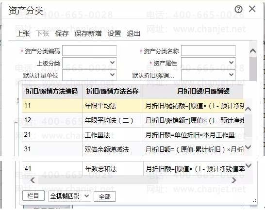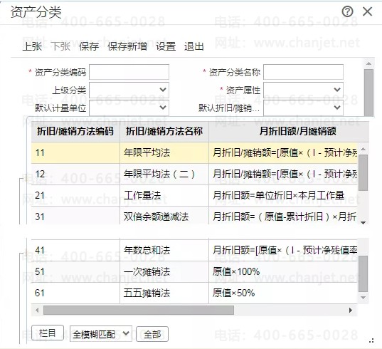 专业版的固定资产折旧方法有七种,分别为:年限平均法,年限平均法二,工作量法,双倍余额递减法,年限总和法,五五摊销法,一次性摊销法;