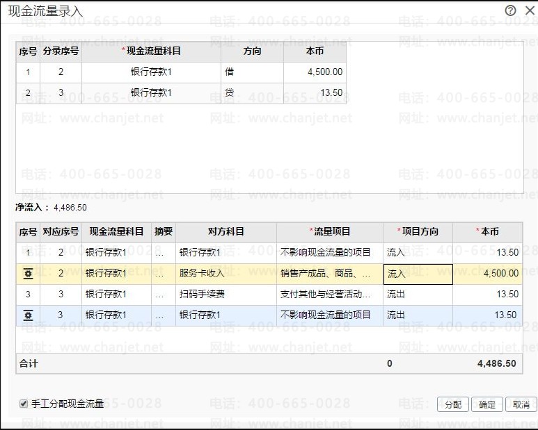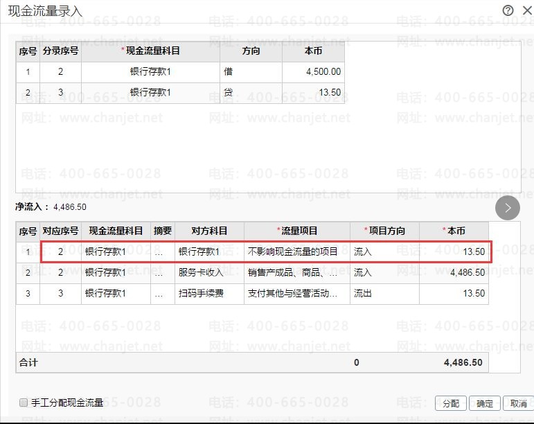 上图例子中可以发现,凭证中“银行存款”科目既有借方,又有贷方,但在现金流量分配明细中,只分配了流入13.5,没分配流出13.5,因此,造成了差额。