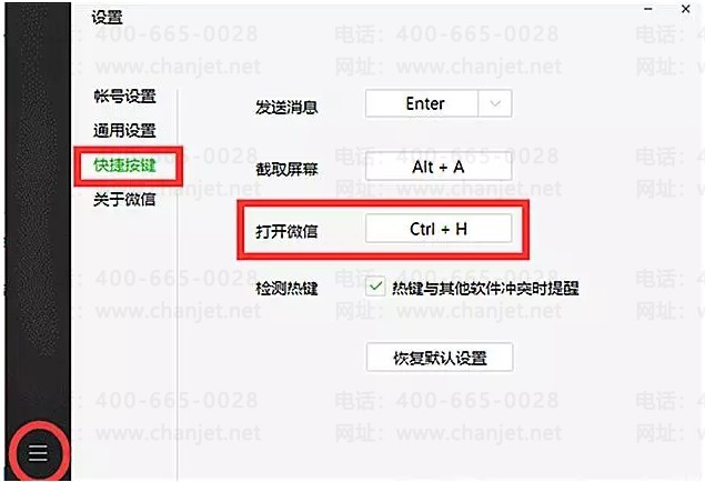 1:微信左下角点击设置——快捷按键——打开微信: