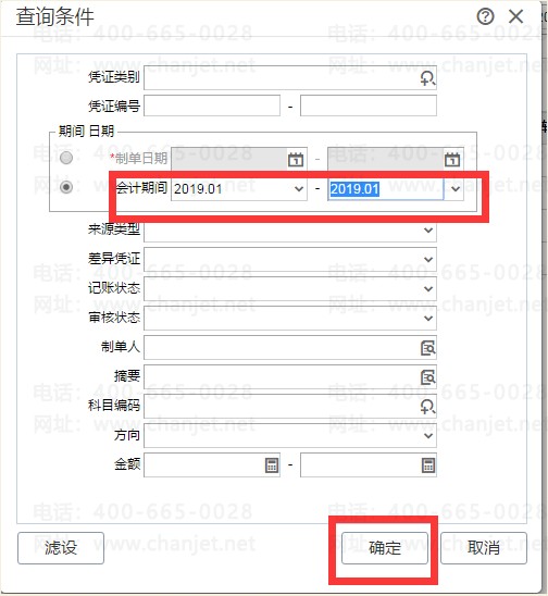 1、总账→凭证→凭证管理;进入“凭证管理”→“查询条件”,选择“会计期间”等查询条件后点“确定”如下图: