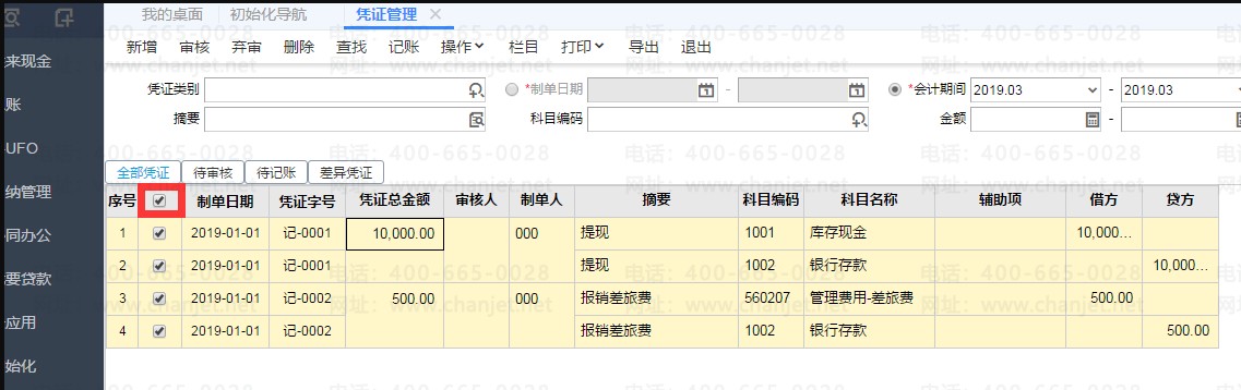 2、进入“凭证管理”,选择需要反记账的凭证,勾上“序号”前的方框表示全选所有凭证,如下图: