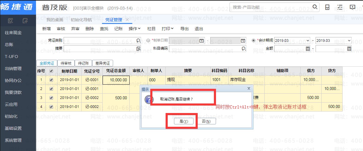 3、同时按键盘上的“Ctrl+Alt+H”按键”→弹出提示:“取消记账,是否继续”→点“是”,如下图: