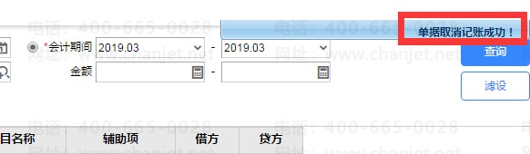 4、右上角出现“单据取消记账成功!”,反记账完成。如下图:
