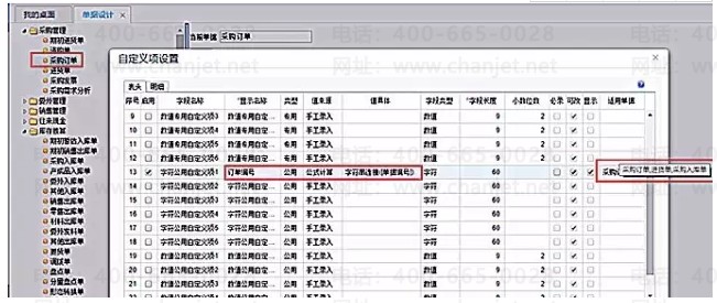 打开单据设计-采购订单-自定义项设置-启用表头字符公用自定义项,值来源选择公式计算,值具体选择单据编号,适用单据采购订单、进货单、采购入库单保存设置。