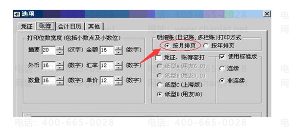 解决方案:在总账的设置-选项中,“账簿”页签下,明细账(日记账、多栏账)打印方式,点编辑,选择“按月排页“后点“确定”。