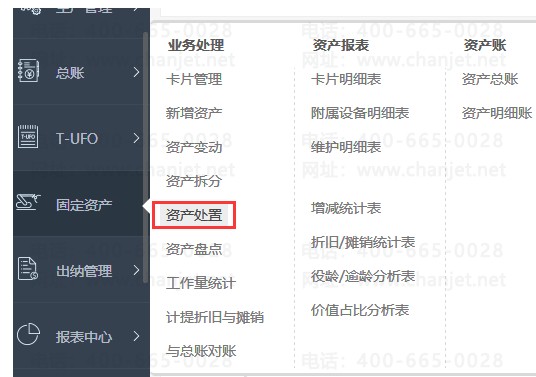 2、左边模块列表点击固定资产——资产处置