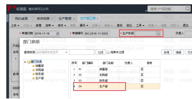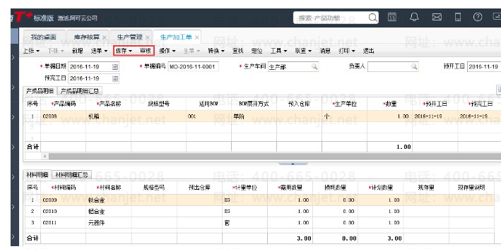 3、选择产成品,输入数量后,根据物料清单自动带出材料配比数量,确认无误后保存
