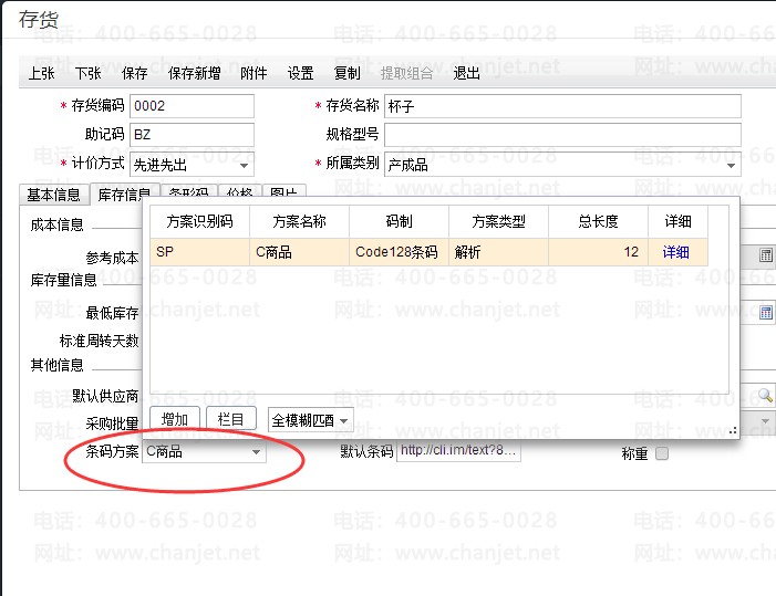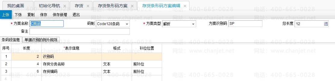 2) 在”基础设置”—”常用信息设置”—”存货条形码方案”中按照要求增加一个存货条形码方案,具体如下: