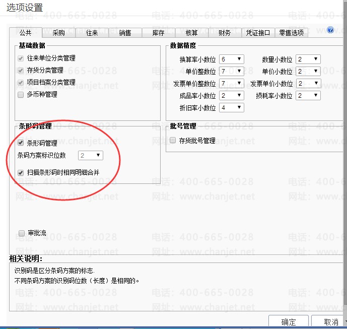 1)在账套的”系统管理”—"账套设置”—"选项设置”的公共页签启用”条形码管理”,并设置”条码方案标志位数”为2。