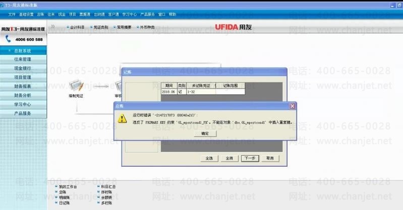 问题现象:用友T3软件,总帐记帐时提示这个报错:运行时错误2147217873,违反了PRIMAY_KEY约束gl_mpostcond1中插入重复键。