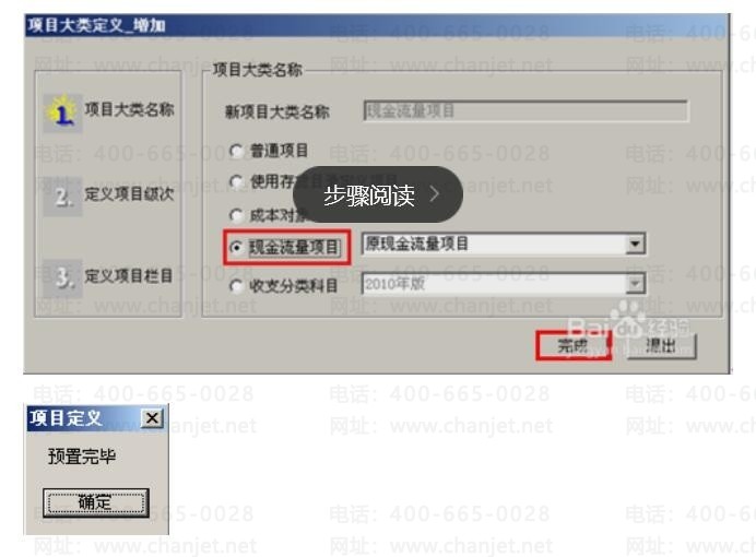 点击“增加”,选择“现金流量项目”,再点击“完成”,提示“预制完毕”,点击“确定”