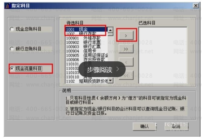 在会计科目中点击“编辑”-“指定科目”,在“现金流量科目”中把“现金”和“银行存款”移到右边已选科目栏,点击“确定”