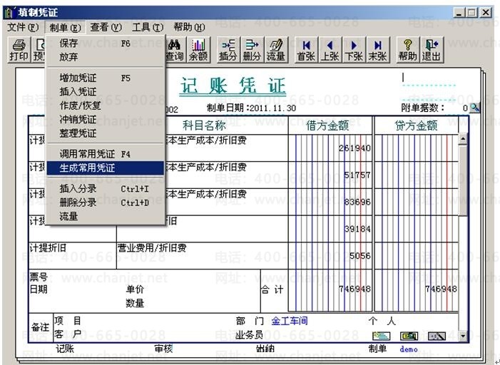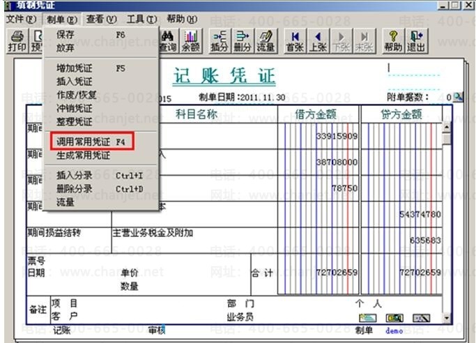 (3)如果需要调用常用凭证,可以在填制凭证的界面点击 “制单”-“调用常用凭证”菜单