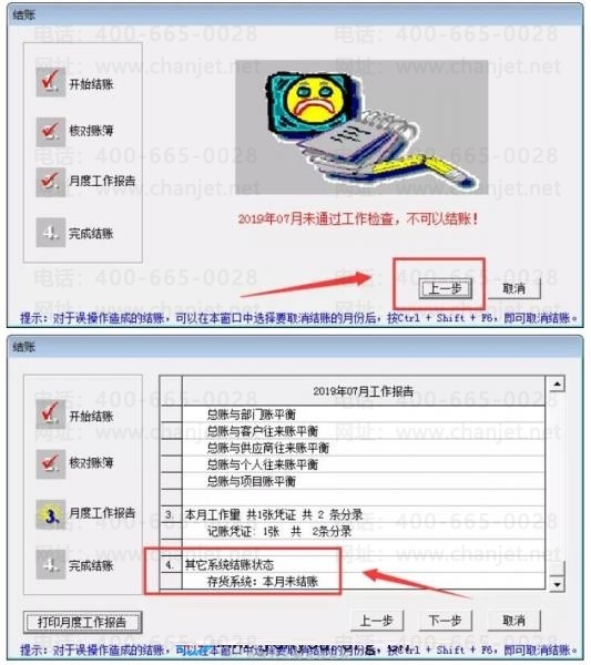 可以看到其实工作报告中已经很明显的告诉了我们不能结账的原因--存货系统:本月未结账
