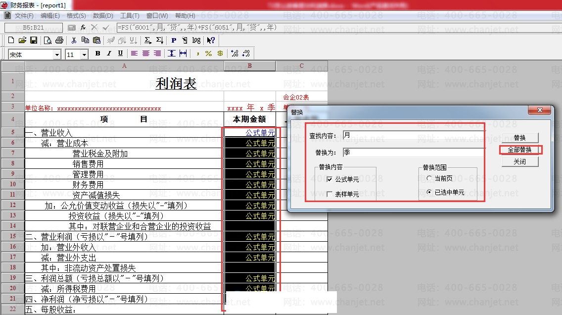 3、选中本期金额公式单元格的公式,右键单击替换,把公式中的月替换为季。
