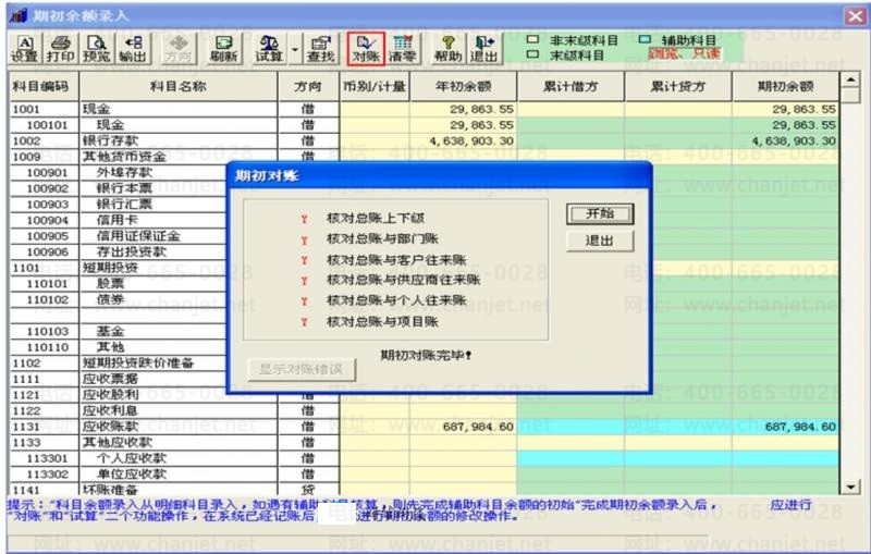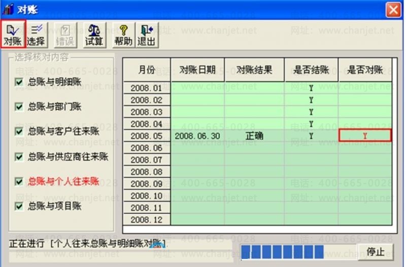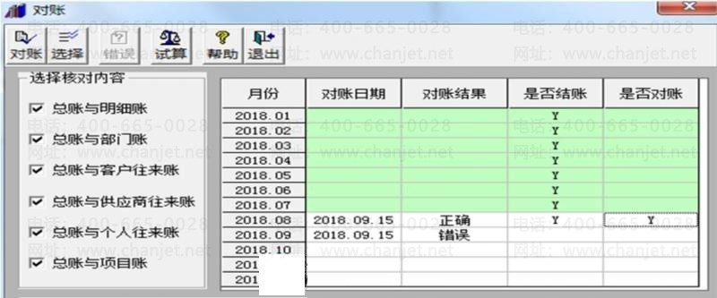 2.如果期初平衡,进入总账—期末—对账,逐个月份检查对账情况