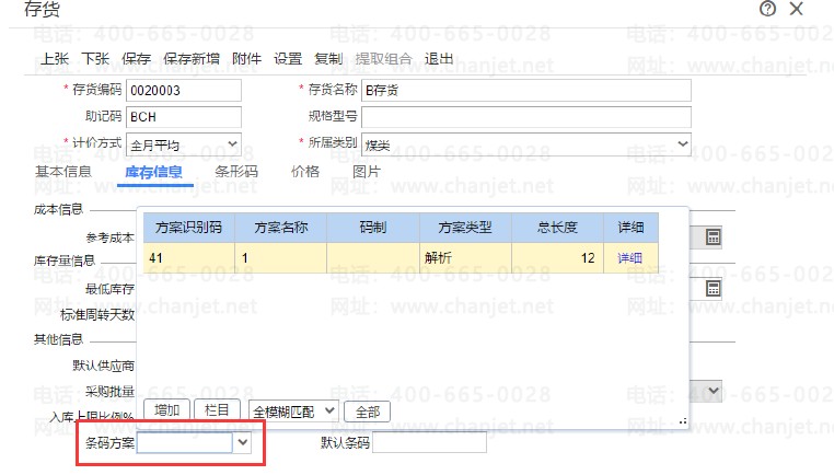 选择商品条码方案入口:【基础设置】-【业务信息设置】-【存货】-【存货档案卡片】-【库存信息】-【条码方案】