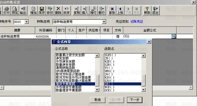 (2)点击“增行”按钮,弹出定义转账凭证样式窗口,按照填制凭证的习惯,先录入借方分录,科目“41010104 生产成本-制造费用”,方向“借”(这里的“方向”指的是在新的凭证中的方向);点击金额公式一栏右侧的放大镜,金额公式本例中由于41010104科目是转入方,取数是取得借贷平衡差额,所以就可以用CE()函数: