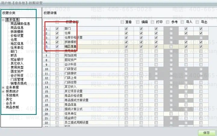 进入权限设置界面,先选中左边的权限分类,包含基本信息,业务单据,报表统计,系统相关,其他,会员卡,商品参照。可以分别选中这些类别进行授权,允许此用户组的操作哪些功能,就在方框中打钩。(注意,每个权限后方还有类似查看,编辑,打印等小权限,也可以进行控制)全部设置好后点击保存。