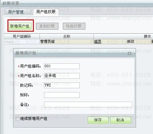 1.进入“维护中心”—“用户权限”—“用户组权限”,点击“新增用户组”,输入编码和名称保存。