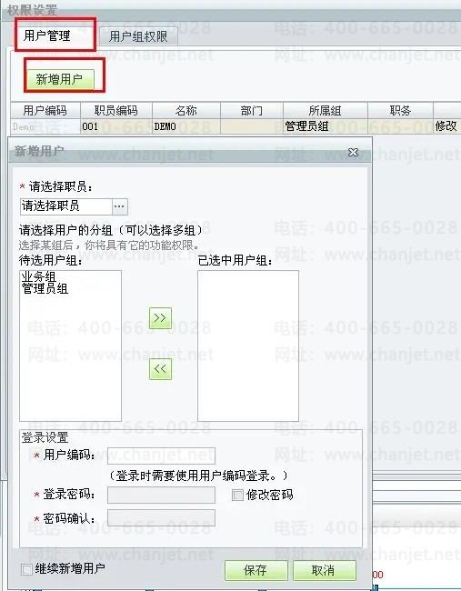 软件中的权限设置分为两块,用户管理和用户组权限。首先需要设置好用户组权限,然后将职员归属到这个用户组中,那此职员就拥有此用户组的所有权限。