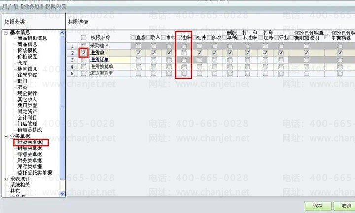 选择“业务单据”—“进货类单据”,首先勾上“进货单”,然后将进货单“过账”权限的√去掉,再点击保存。