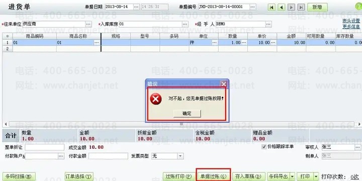 进入进货单操作,点击“单据过账”会提示“对不起,您无单据过账权限”