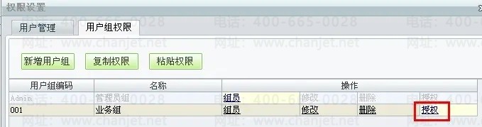 2.选中要设置权限的用户组,点击其后方的“授权”