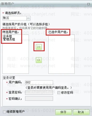 将职员归属到用户组中。选择“待选用户组”中的某个用户组,然后点击向右的箭头,就能将其过渡到“已选用户组”中,这样此职员就属于这个用户组,并且能使用这个用户组的所有权限。