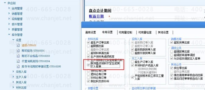 Ø 库存管理-设置-选项-倒冲盘点领料不足生成其他入库单