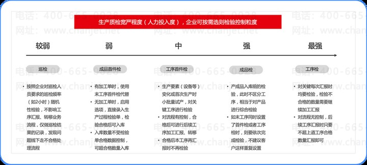系统支持全生产检验业务类型,客户可根据检验控制粒度以及人力资源情况选择合适自己的检验控制方案:
