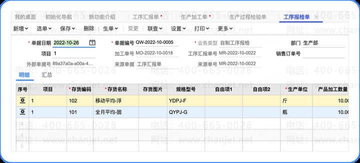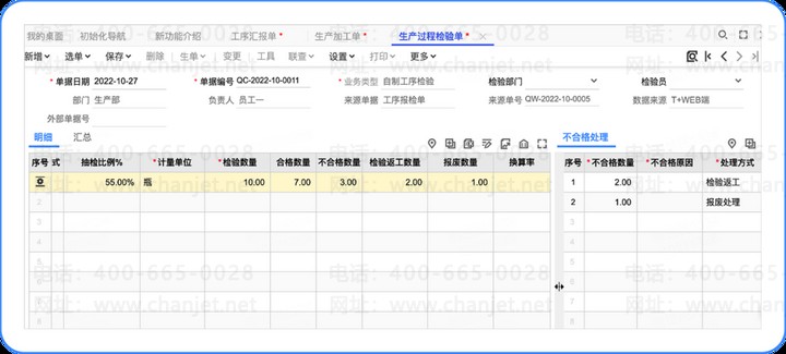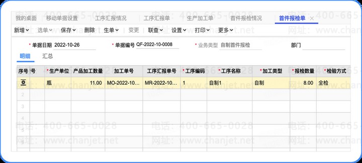 检验单,由首件报检单或工序报检单生成,巡检业务时可直接录入,可用于记录过程检验结果: