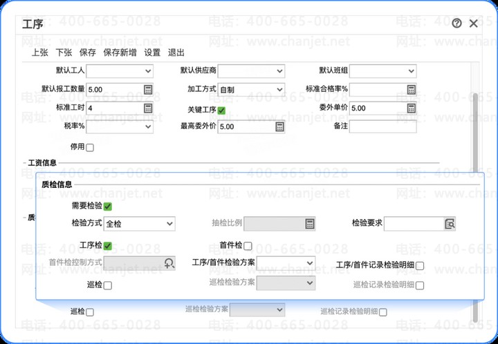 检验设置 - 工序:预设哪些工序需要检验,默认会带入工艺路线、BOM中,后续可再修改。