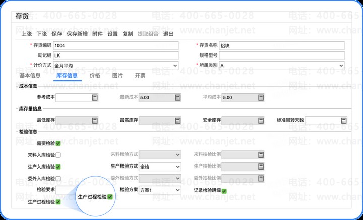 检验设置 - 存货:设置了生产过程检验的存货才可以进行过程检验相应设置。