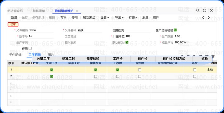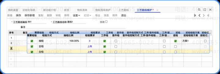 检验设置 - 工艺路线:预设哪些工序需要检验,默认带入工序中的设置,可修改,后续可带入BOM。