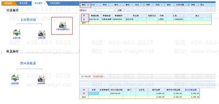 2. 【收支操作】-【付款申请单支付】中参照付款申请单生成付款单。