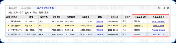 生成日记账后的银行流水中也会有关联单据,点击可进行联查。