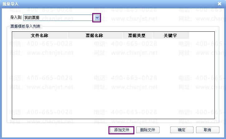 3.以【批量导入票据】为例:在批量导入窗口选择票据组,点击【添加文件】,如图3:
