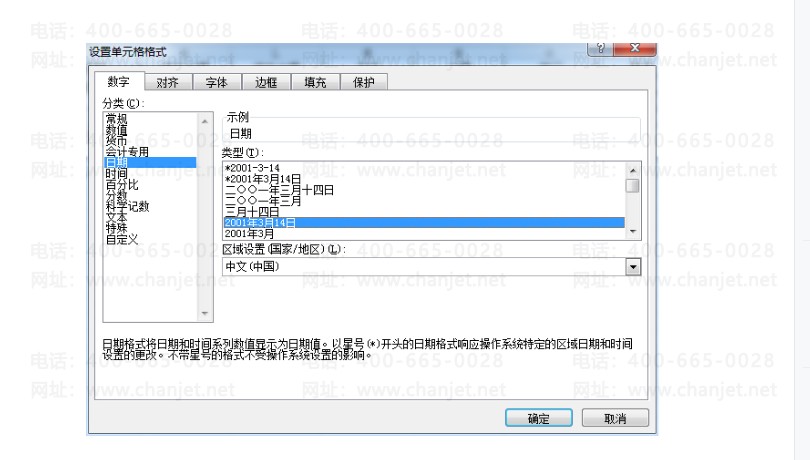4.然后在选中日期这一列,鼠标右键单击,点击设置单元格格式,分类选择日期,类型选择2001年3月14日: