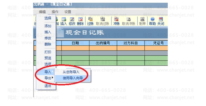 6.好了,到此为止,前期工作结束,开始导入啦。登录002出纳账套,进入账户,点击编辑-导入-使用导入向导: