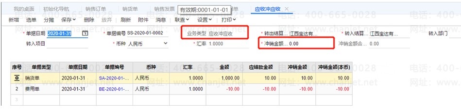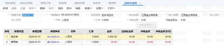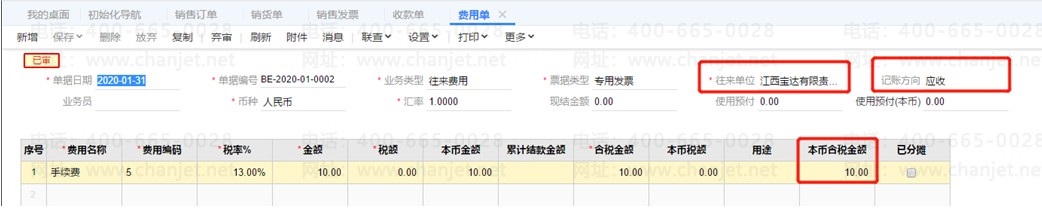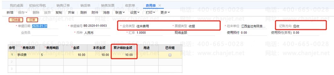 6、收款单生成费用单同时,该笔销售费用自动冲抵此笔业务的剩余应收账款