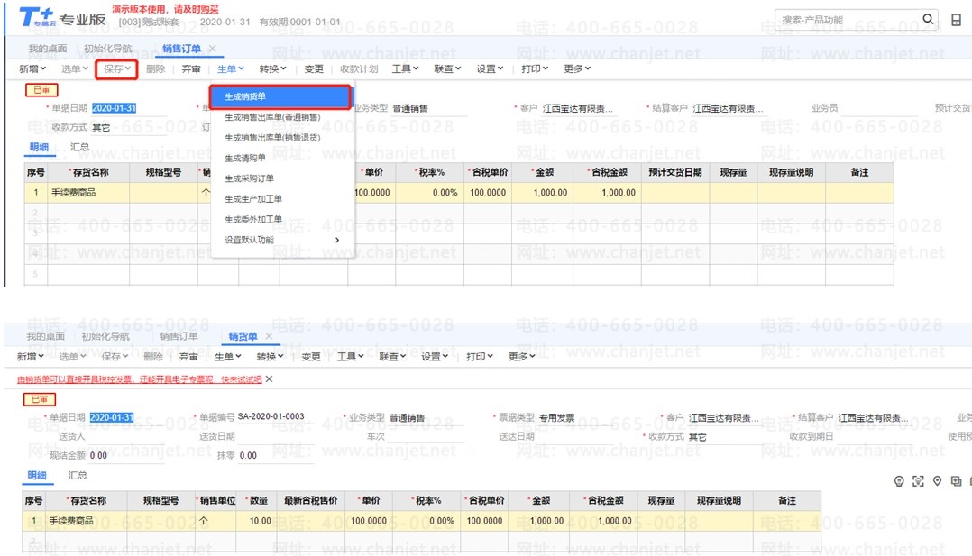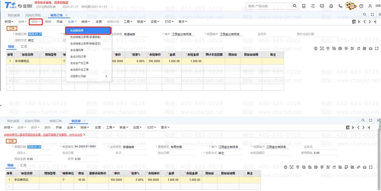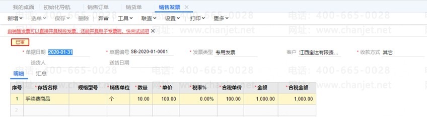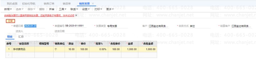 2、在销售模块填制销售订单数量是10 含税单价是100 价税金额是1000元保存审核后流转生成【销货单】-【销售发票】