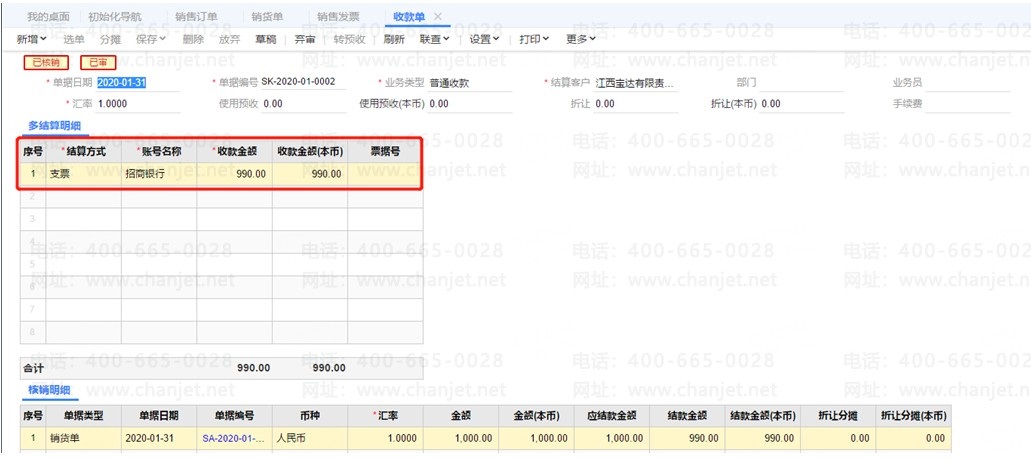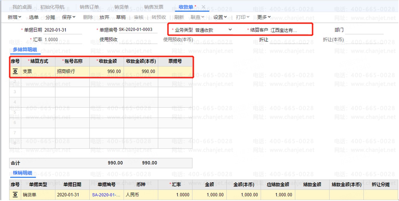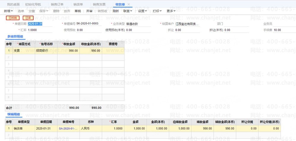 3、月底收到江西宝达客户款项1000元,增加一张收款单,但是在POS机刷卡时发生10元的手续费