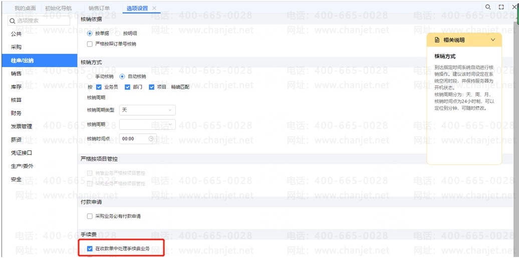 1、点击【系统管理】-【选项设置】-【往来/出纳】勾选上【收款单处理手续费用业务】