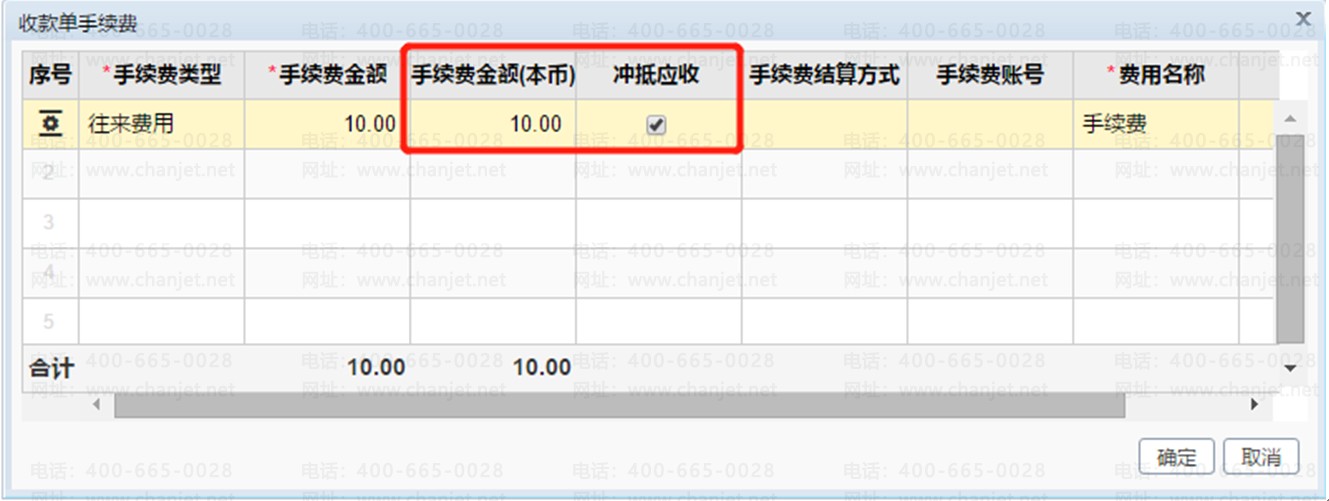 4、点击收款单表头上的【手续费】录入10元往来手续费用 并且勾选上【冲抵应收】分摊到应收账款金额里