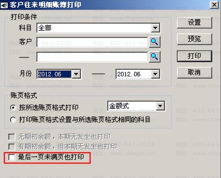都能查询出来的,并且发生的笔数都比较少,大都是3、4笔,多的只有十多笔,那么打印的时候是没有满一页的,第一页即最后一页未满页,打印的时候没有选择“最后一页未满页也打印”。
