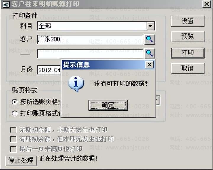在总账账表查询下面的客户往来辅助账中查询客户明细账选择任何一家客户都有发生明细,但是在账簿打印辅助账打印中打印客户往来明细账,科目选择全部,选择一家客户点击打印或者预览都提示无可以打印的数据,凭证全部都已经记账。