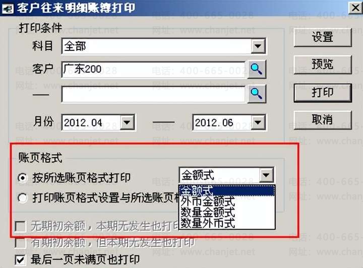 主要是账簿打印界面默认的账页格式都是金额式,此时如果选择打印账页格式设置与所选科目账页格式相同的科目+金额式就打不出来,需要选择按所选账页格式打印+金额式或者选择打印账页格式设置与所选科目账页格式相同的科目+数量金额式才能打印。