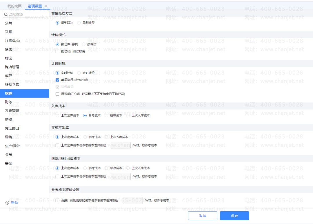 T+核算选项可以设置计价模式、计价时机、暂估处理方式、入库成本、零成本出库、退货/退料出库成本等,详细说明请见下图: